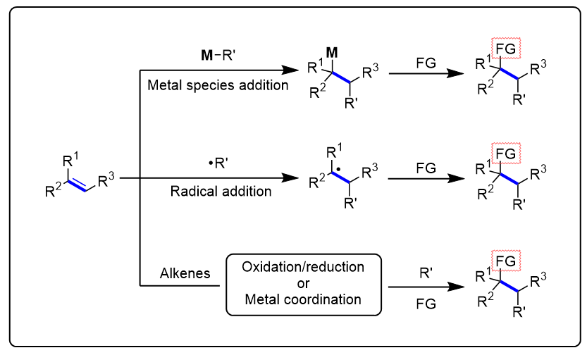烯烃是一类具有碳碳双键的重要有机化合物,在工业和自然界中都有广泛的来源。π键的存在是其能够进行多样化转化的基础。本综述以关键活性物种为切入点,系统揭示了有机金属物种、活性自由基物种、烯烃的离子型自由基物种的化学性质与反应特性。此外,本综述还详细阐述了金属物种、自由基物种介导的烯烃加成过程与烯烃的单电子转移过程在分子间烯烃双官能团化反应中的应用。