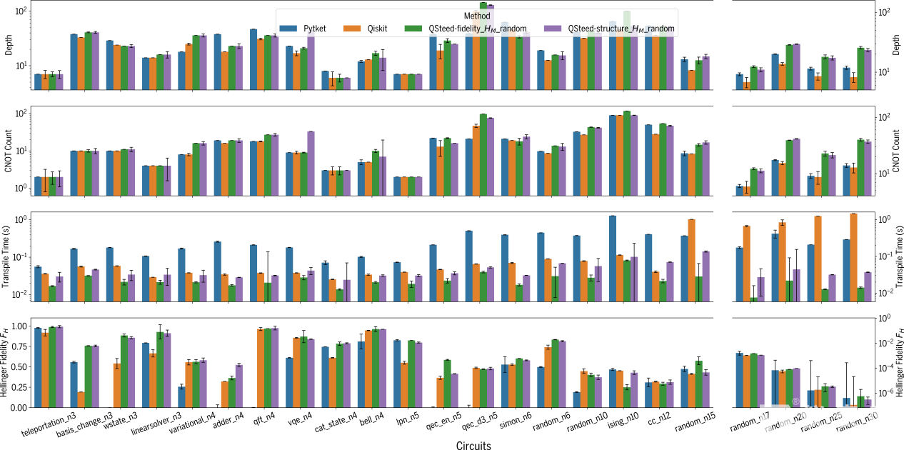 图2 不同量子编译器在百花(Baihua)芯片上的性能对比。每个基准电路的结果取5次运行的中位数,而随机电路的结果则为超过50个随机生成电路运行结果的平均值,误差棒表示标准误差。纵轴从上到下依次表示:编译后电路深度、CNOT门数量、转译时间,以及Hellinger保真度。除随机电路外,横轴上各电路名称(末尾数字表示量子比特数量)均来自QASMBench基准测试集。
