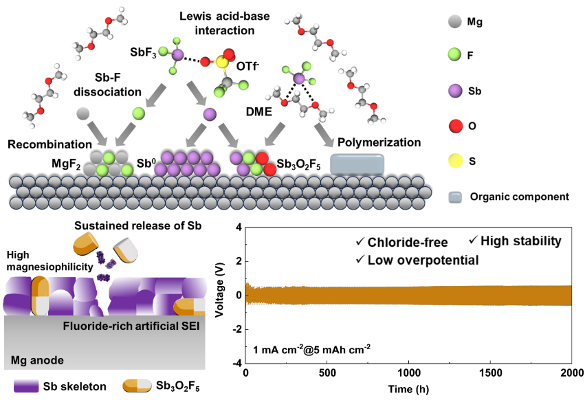 团队也设计了基于强路易斯酸碱相互作用促进金属氟化物解离并构建亲镁界面层的负极改性策略,实现了无氯镁电池的稳定运行。在含有路易斯碱性位点的三氟甲烷磺酸镁添加剂促进Sb-F键解离后,在Mg电极表面制备了亲镁的Sb骨架。而置换产物MgF2具有不同寻常的单斜结构,可以提高界面内的电子绝缘和Mg2+传输,保证Mg2+的快速扩散,抑制电解质的钝化。同时,界面副产物氟氧化锑的存在能够降低镁离子去溶剂化的能垒,并且在快速镁沉积和剥离过程中氟氧化锑的持续还原可弥补失效的亲镁Sb位点,提高镁电池的长期循环稳定性。在这种人工SEI保护下,对称电池在常规Mg(TFSI)2/DME电解质中,在1 mA cm-2的高电流密度和5 mAh cm-2中的高面容量下可实现>2000小时的镁沉积/剥离循环。相关成果发表于Adv. Energy Mater. 14, 2401507, 2024。
