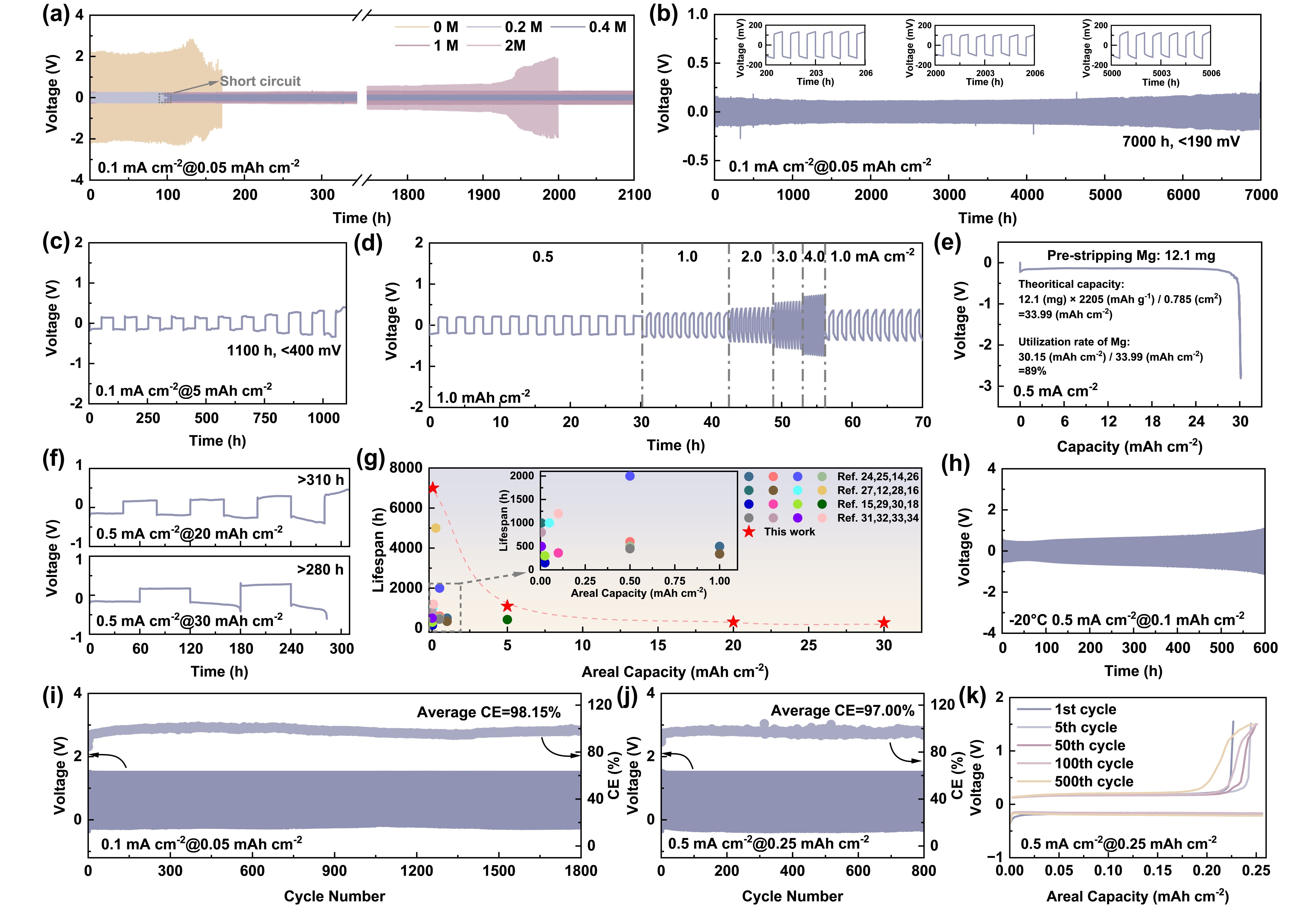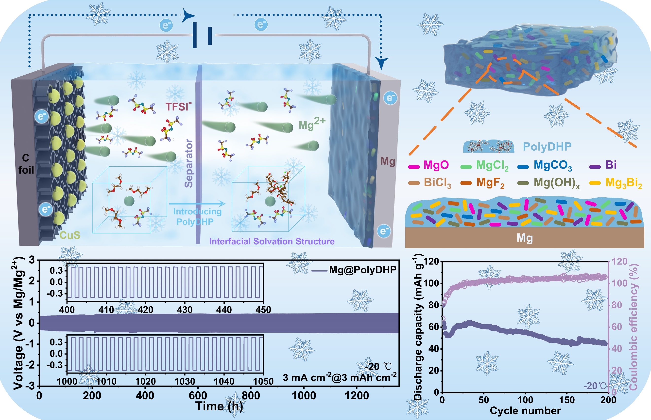 该团队也联合上海大学高彦峰教授提出采用聚(3,4-二氢-2H-吡喃)(polyDHP)对镁金属负极进行改性来调控界面溶剂化结构,进而实现快速的Mg2+传导。PolyDHP固有的空间位阻以及其与Mg2+的静电相互作用能够降低第一溶剂化鞘层中的溶剂分子,增加阴离子和polyDHP的含量,从而降低Mg2+的去溶剂化能垒。并且,在镁负极表面低聚物的玻璃化转变作用下,界面相在-20 ℃下具有更规整的结构,表现出更加连续的离子传输通道,从而首次实现了镁金属电池的低温可逆循环。室温时,在5 mA cm-2和10 mAh cm-2条件下,镁对称电池能够循环5000 小时;-20 ℃时,在3 mA cm-2和3 mAh cm-2条件下,镁对称电池能够循环1300 小时,采用CuS正极的全电池能够稳定循环200圈。这项工作为镁金属电池在极端环境下应用提供了新的解决方案。相关成果发表于ACS Nano 19, 16877-16889, 2025。