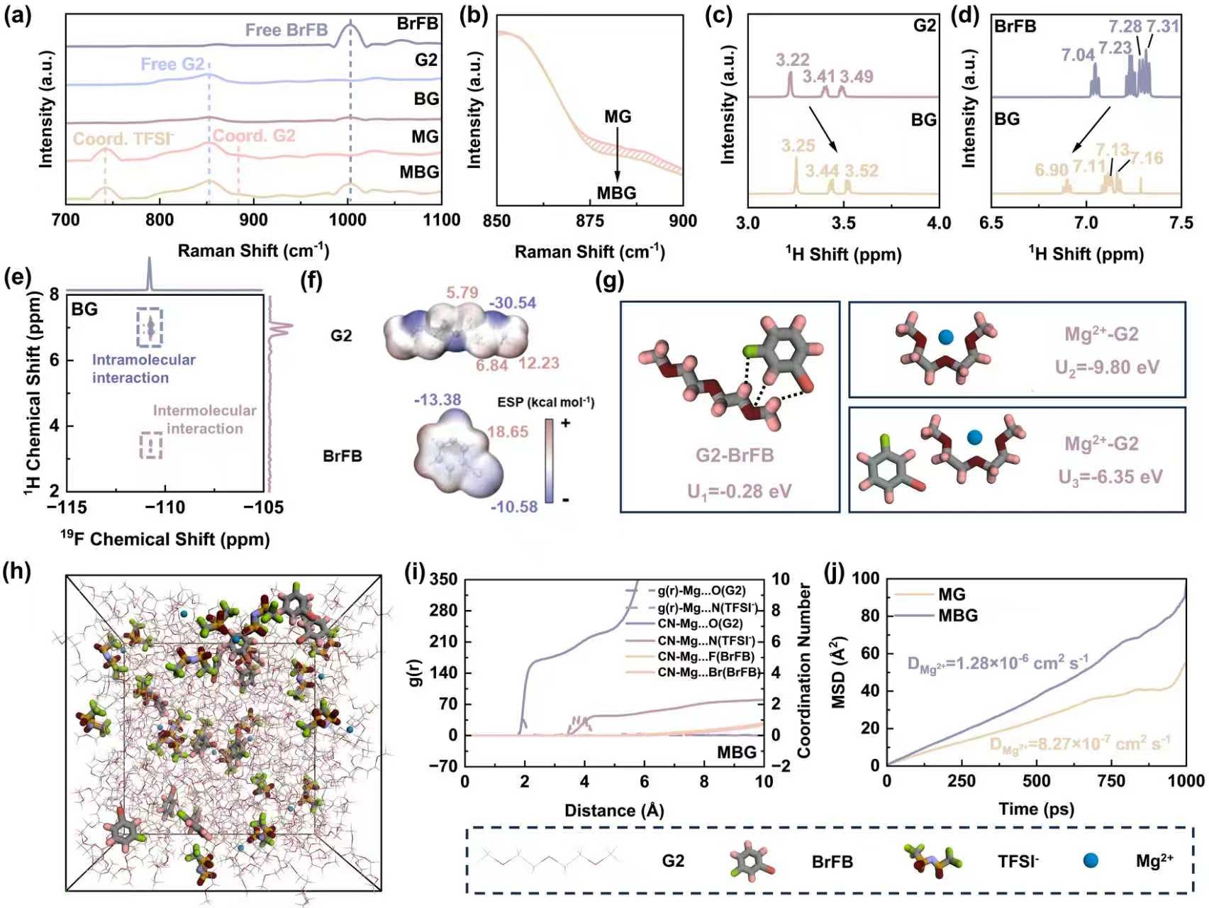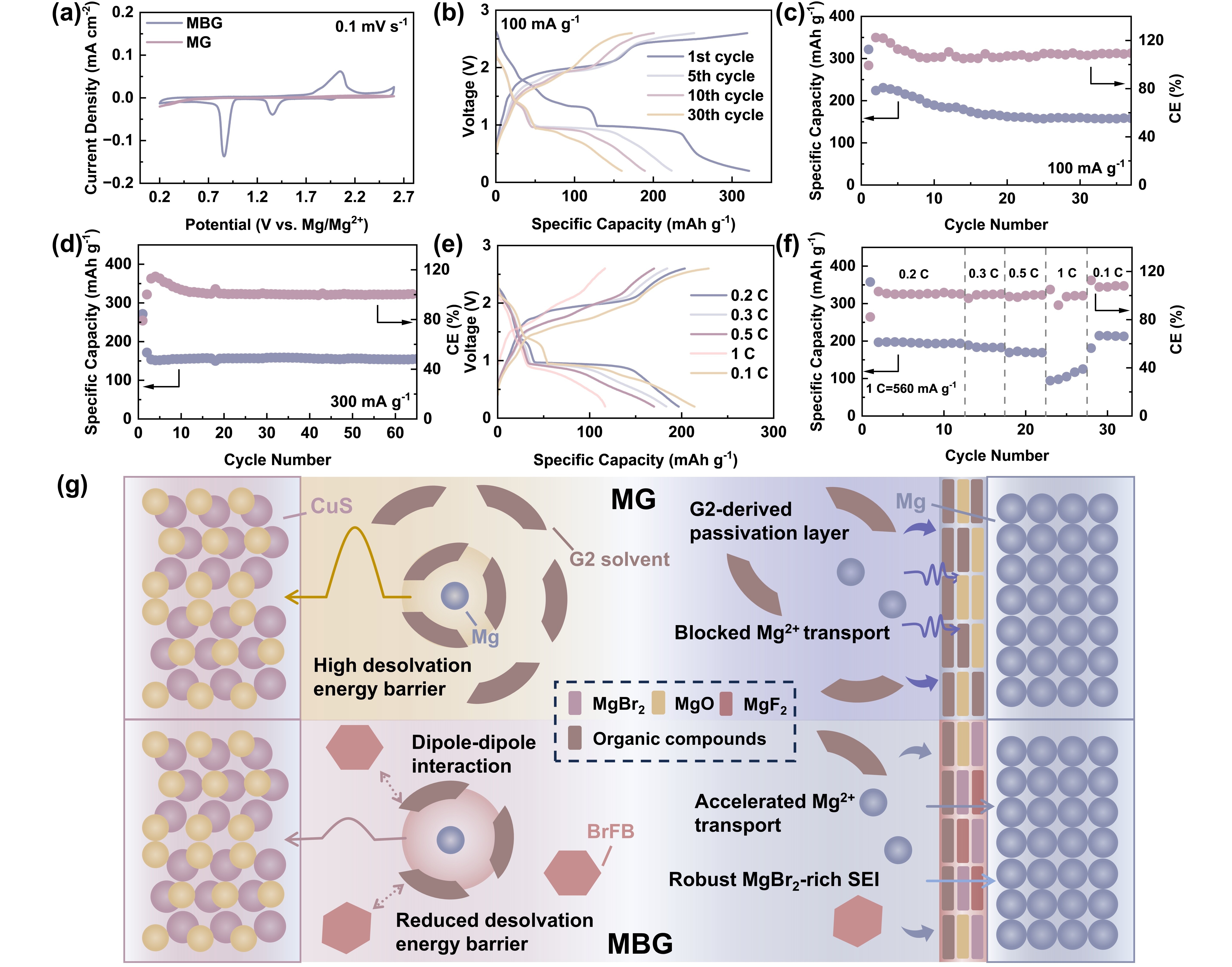 近日,中国科学院上海硅酸盐研究所李驰麟研究员团队通过引入间溴氟苯(BrFB)电解液添加剂,建立了“晶面取向调控-界面工程-溶剂化结构优化”的多级协同机制。在镁沉积行为调控方面,BrFB凭借其溴/氟官能团对Mg(002)晶面的特异性吸附,有效阻断了镁原子的水平堆叠生长,诱导形成了垂直取向的(110)晶面主导的均匀沉积,实现了超高面容量下的致密阵列结构镁负极。在界面化学层面,BrFB在电化学循环中原位分解形成Br/F杂化SEI,其中MgBr2组分构建低迁移能垒(0.27 eV)的离子传输通道,而MgF2纳米域提供电子绝缘屏障和机械支撑,协同抑制负极枝晶生长与界面副反应。在溶剂化结构调控中,BrFB与二乙二醇二甲醚(G2)溶剂通过C-F/C-Br…H-C偶极相互作用重构外层溶剂鞘,显著削弱Mg2+-溶剂配位强度,降低脱溶剂化活化能。该协同机制使镁对称电池在30 mAh cm-2超高面容量下稳定循环280小时(镁利用率89%)及-20℃低温下稳定运行600 小时;过电位显著降至190 mV,并可实现7000小时的超长稳定循环,突破了已报道添加剂策略的寿命极限。匹配CuS正极的全电池在300 mA g-1下保持了155 mAh g-1可逆容量,证实了该策略对高能量密度镁电池实用化的推进价值。相关成果发表于Energy Environ. Sci. 18, 7254-7266, 2025。