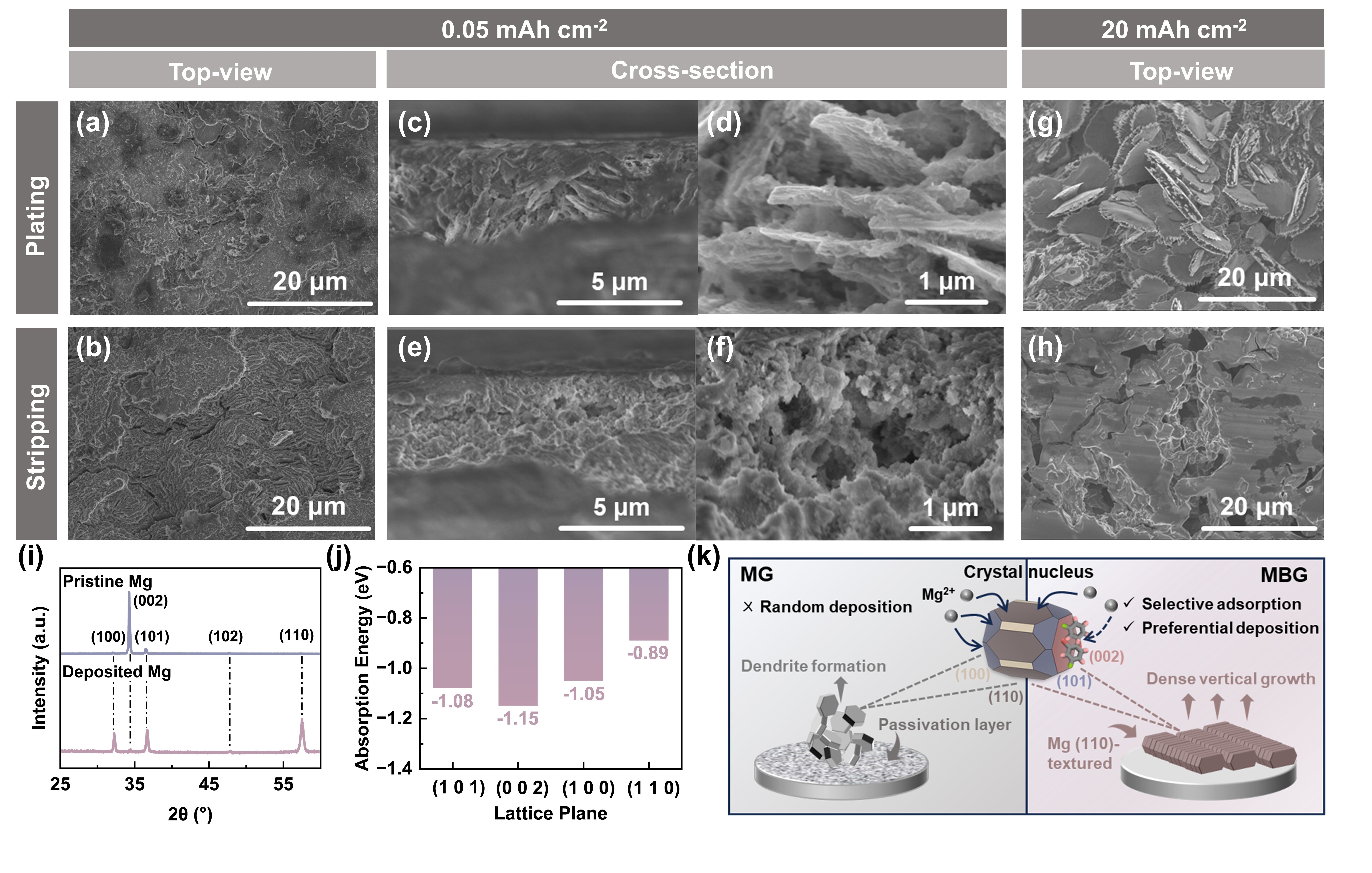 镁金属电池凭借负极材料的高理论容量(3833 mAh cm-3)、资源丰度及本征抗枝晶特性,被视为下一代储能体系的有力候选。然而,其实际应用面临三重核心挑战:界面钝化问题:高电荷密度的Mg2+易与溶剂/杂质反应生成绝缘层(如MgO、MgCO3),阻碍离子传输并增加成核能垒;动力学限制:强溶剂化作用(尤其与醚类溶剂)导致脱溶剂化困难,低温下性能进一步恶化;极端工况下的枝晶风险:高面容量(>10 mAh cm-2)或高电流密度下,传统水平取向的(002)镁晶面虽热力学稳定,但缓慢的动力学易引发局部电场畸变和镁枝晶生长。现有策略如人工SEI或电解液改性(卤化物/亲核添加剂)虽能部分缓解钝化,却难以协同解决镁负极侧沉积取向失控(高面容量下无序堆积)、SEI机械稳定性不足(循环体积变化致破裂)及溶剂化结构僵化(脱溶剂能垒高)等瓶颈。因此,亟需开发兼具晶面调控、界面稳定与动力学优化的新机制,以实现超高面容量、长寿命及低温下的无枝晶镁金属负极。