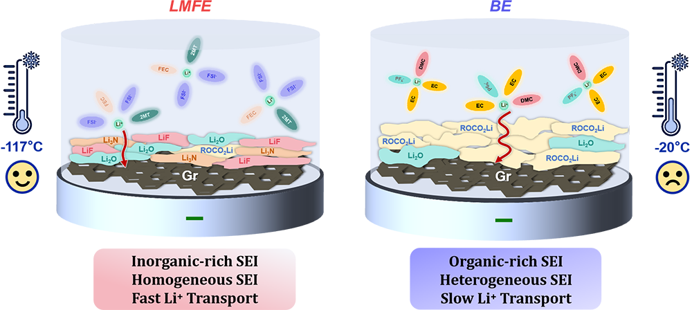 磷酸铁锂(LiFePO₄, LFP)||石墨(Gr)电池因高安全性、长循环寿命及低成本优势,在储能和动力电池领域占据主导地位 。然而,该体系在低温(< -10 ℃)及高倍率(> 3 C)条件下性能急剧恶化,表现为容量显著衰减、极化电压增大及析锂风险 。这主要归因于低温下缓慢的去溶剂化动力学与界面Li⁺传输受阻 。传统碳酸酯基电解质(如EC)熔点高,低温下易凝固或粘度剧增;而低熔点的线性碳酸酯虽能改善流动性,但其与Li⁺的强配位作用导致去溶剂化能垒过高,且在石墨表面形成的富含有机组分的SEI膜阻碍了离子快速传输 。因此,开发兼具低凝固点、弱溶剂化特性且能抑制溶剂共嵌入石墨的新型电解质,对于提升LFP||Gr电池在极端环境下的性能至关重要 。