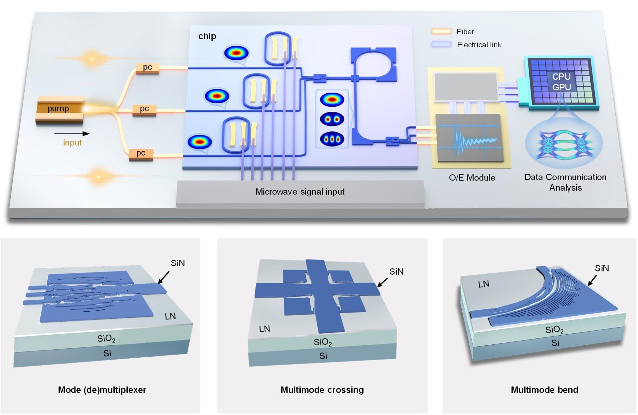 为进一步验证系统级综合性能,团队在同一芯片上集成了高速电光调制器。实验结果表明,该集成系统在实现多模信号传输的同时,单个通道的数据调制速率高达120 Gbps。这充分证明了该技术方案不仅能实现器件高密度集成,还能保持铌酸锂材料本身的高速电光调制优势,标志着薄膜铌酸锂光子集成技术向“更高密度、更小尺寸、更强功能”迈出了关键一步,为未来研制超大容量、超高速率的光通信与光计算芯片奠定了核心技术基础。