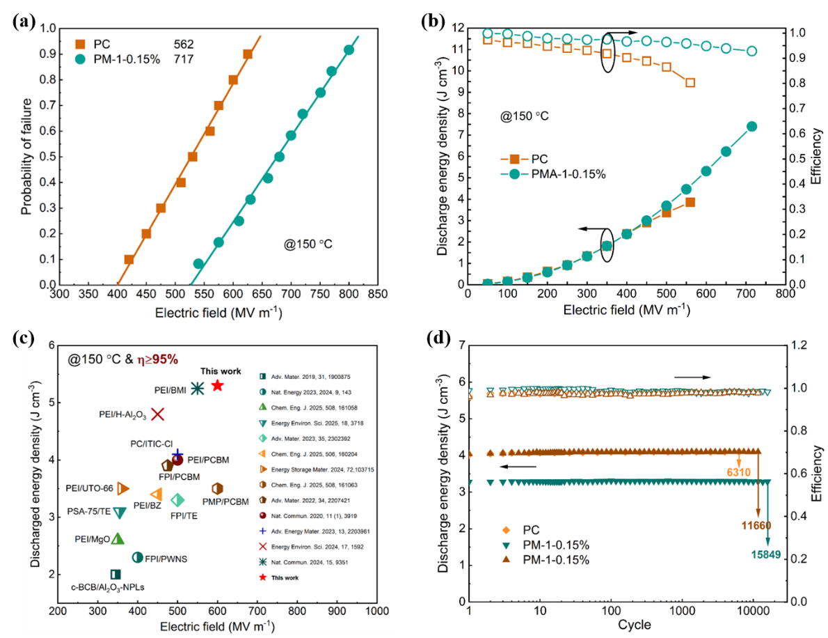 通过上述分子级设计,PC/MACs 复合材料在极端条件下实现了关键性能的协同突破:1. 降低漏导损耗:MAC-1的引入使陷阱深度从纯PC的0.89 eV增至复合材料(PM-1-0.15%)的1.12 eV,150℃下的漏电流密度从纯PC的8.8×10-9 A cm-2降至PM-1-0.15%的9.3×10-10 A cm-2,减少幅度达89%;2. 强化击穿与耐热性:复合材料在150°C下的击穿场强从562 MV m-1提升至717 MV m-1。同时,材料玻璃化转变温度(Tg)仍保持在180°C以上,具备良好的热稳定性;卓越的高温储能性能:在150°C和717 MV m-1的高电场下,复合材料的放电能量密度达到7.4 J cm-3,放电效率达93%。比纯PC(能量密度4.5 J cm-3,效率80%)显著提升;优异的循环寿命:在150°C下进行充放电循环测试,该复合材料在3.3 J cm-3和4.0 J cm-3能量密度下的寿命分别达到15,849次和11,660次,是纯 PC 寿命(6,310次)的两倍以上。