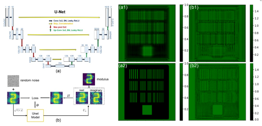 2. AI赋能提升成像质量,实现无透镜高分辨成像:为攻克原子传感成像中分辨率低的难题,融合量子传感与人工智能,提出物理约束的深度学习算法。该方法在不依赖大量训练数据的情况下,有效抑制噪声与衍射伪影,实现宽视场下分辨率超过1.25 lp/mm的无透镜成像,显著提升了成像质量与应用潜力。
