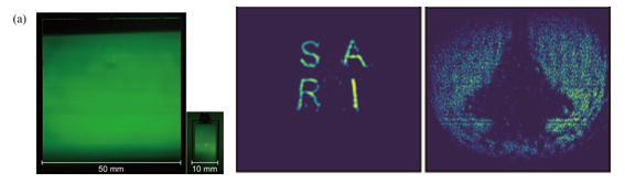 4.扩大成像视场,推动系统走向实用化:针对成像面积受限的问题,提出了一种基于大尺寸原子气室和均匀激光整形的优化策略,实现了50mm × 50mm的大视场太赫兹原子成像。该系统有效扩展了探测视场,提高原子荧光分布的空间均匀性,使太赫兹量子成像从以往的毫米尺度验证,迈向更接近实际应用需求的系统尺度。进一步将该系统已成功应用于液体混合过程的可视化监测,展现出在化学检测与生物扩散过程分析中的潜力。