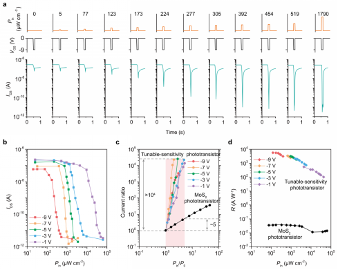 图3.可调灵敏度光电晶体管的光电性能。a 器件在不同光强和不同栅压条件下的光响应行为,表明其光电响应可通过栅压进行有效调控。b 不同栅压下器件电流随入射光强变化的关系,显示出对特定光强区间的增强响应特性。c 可调灵敏度光电晶体管与传统光电晶体管在不同光强条件下的电流变化对比,表明该器件能够放大目标光强变化并抑制无关背景信号。d 可调灵敏度光电晶体管与传统光电晶体管在不同光强条件下的响应度对比,显示其在低光强和低对比度条件下具有显著优势。