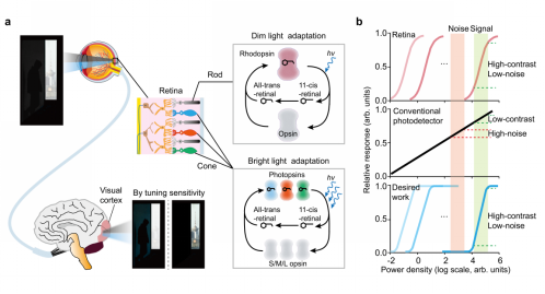 图 1.仿生可调灵敏度光电探测器。a人眼视网膜通过光适应机制在不同光照条件下实现高效视觉感知。视杆细胞和视锥细胞可根据环境光强动态调节自身灵敏度,从而在强光与弱光条件下均保持良好的感知能力。b 视网膜、传统光电探测器与仿生光电探测器的光响应特性对比。视网膜和仿生光电探测器能够突出目标与背景之间的相对光强差异,并有效抑制无关噪声;而传统光电探测器由于灵敏度固定、响应关系单一,难以对低对比度目标进行有效识别。