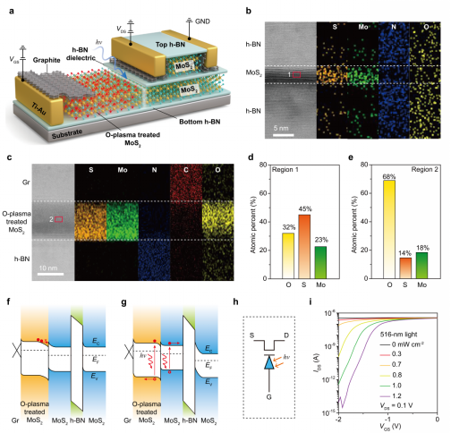 图2.可调灵敏度光电晶体管的结构与工作特性。a 可调灵敏度光电晶体管的结构示意图,由MoS2场效应晶体管与光电二极管集成构成。其中,h-BN同时作为介电层和保护层,石墨作为接触电极与栅极。b,c 器件关键异质结构的截面高分辨透射电镜图像,表明各功能层之间界面清晰、结构完整。d,e 氧等离子体处理前MoS2中元素组成的变化,验证了光电二极管的形成。f,g 器件在暗态与光照条件下的能带结构示意图,展示了光照引起的电学调控机制。h 器件等效电路示意图。i 器件在暗态及不同光强照射下的转移特性曲线,表明其光响应可随光强和栅压实现有效调控。