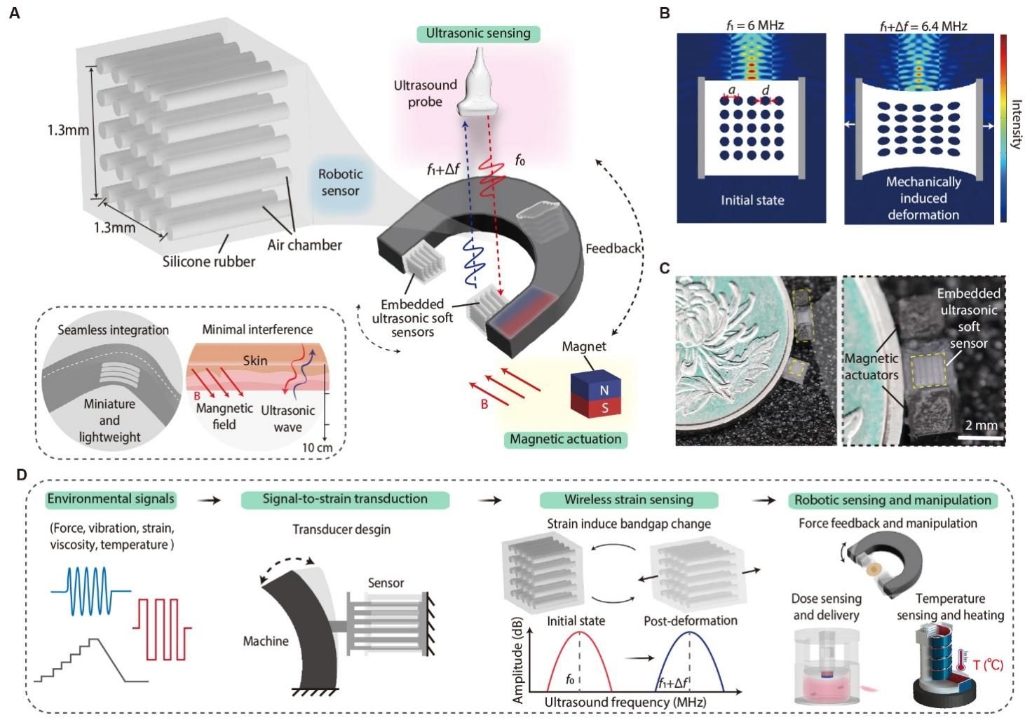具备无线传感与操控能力的智能微型系统,被认为是推动生物医学应用的重要方向。但在毫米乃至更小尺度上,传感与驱动往往互相“打架”,使系统难以同时做到小型化、稳定和高性能。研究团队提出一种“机器人传感器”,将嵌入式超声软传感器(EUSS)与磁性执行器深度集成,突破小尺度传感——驱动不兼容瓶颈,构建无线传感与操控一体化的微型机器。EUSS与软/硬部件均兼容;依托机载换能器与无源超声通信,配合外部磁场,可对力、振动、黏度、温度等环境参量进行无线检测与调控,且不同物理场间干扰最低。在兔与猪模型中,系统完成基于频谱反馈的闭环操控,展示了精准剂量释放/给药与在位生理监测等关键能力。该研究为智能微型系统提供新的平台与工程路线,有望加速其在微创治疗与临床监测中的落地应用。