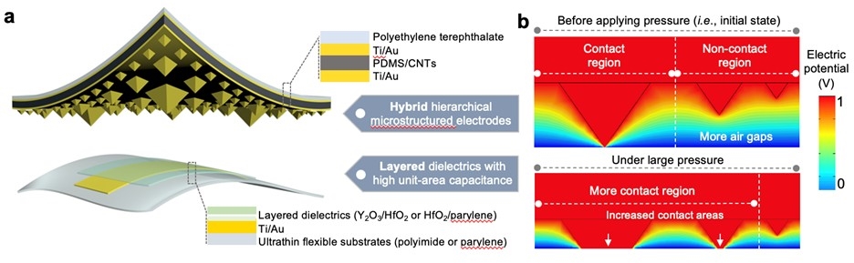 图1. 接触主导的局域电位移场增强型压力传感器。a,传感器结构示意图,展示了分级微结构电极与高单位面积电容的介电层。b,施加压力之前和高压下的电势分布的横截面图