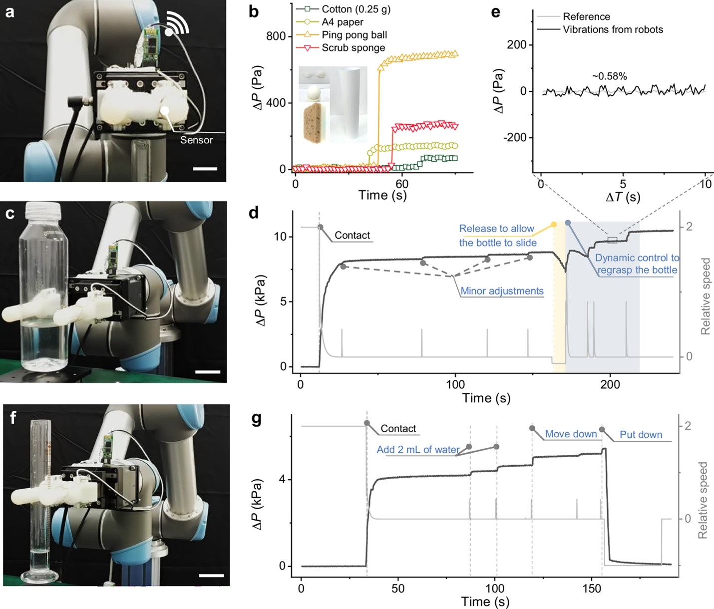 图3. 压力传感器在机器人精准操控中的应用。a,配备传感器的机械手抓取棉花的照片。b,抓取各种物体时压力变化的动态。c,配备传感器的机械手抓取装有水的瓶子的照片。d,抓取和提起瓶子以及发生滑落时的压力变化和速度调整。e,传感器检测到的机械振动引起的测量压力变化。f,配备传感器的机械手夹持器抓取装满水的量筒的照片。g,抓取量筒时夹持器的压力变化和速度调整