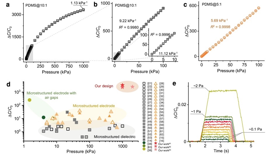 图2. 接触主导的压力传感器的性能表征。a—c,传感器的归一化电容变化与压力关系曲线,展示了其超高的响应和优异的线性度。d,与此前各类微结构压力传感器相比,该设计在灵敏度和响应范围上均实现了突破。e,小压力下的压力响应,可以分辨出~1Pa时归一化电容变化的十分之一(即~0.1Pa)