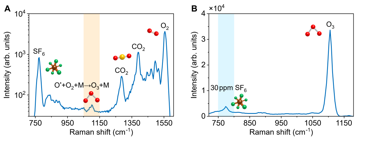 图2. 基于级联放大方案发展的单光束相干拉曼光谱技术在多组分、高灵敏气体检测中的应用展示。(A)实现多种分子同时探测;(B)实现浓度为30 ppm的SF6气体的检测。