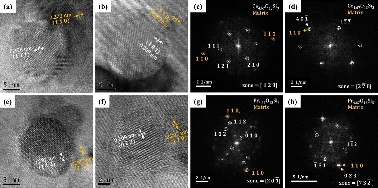 图1纳米颗粒与基体的界面关系:(a-d) Ce4.67O13Si3纳米颗粒;(e-f) Pr4.67O13Si3纳米颗粒
