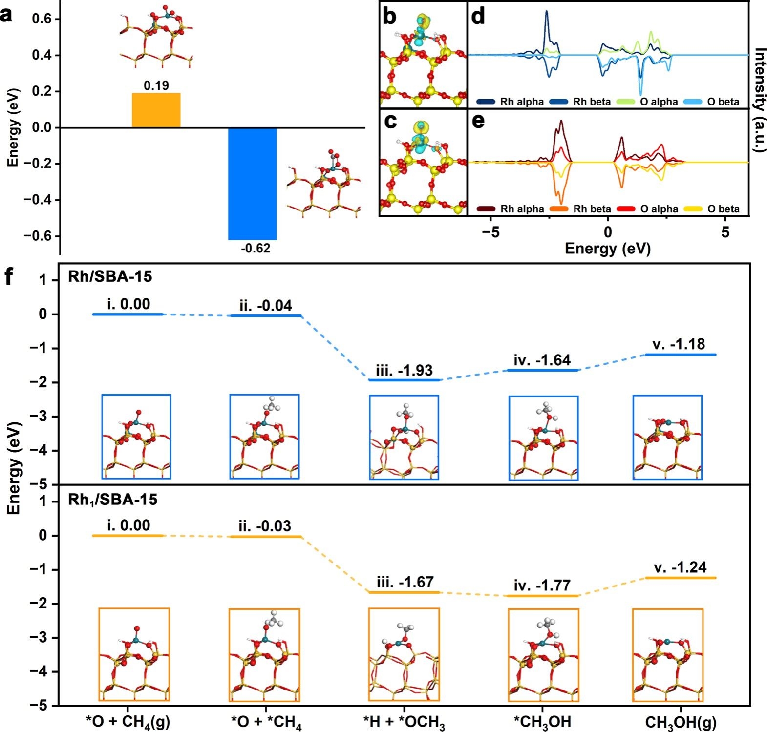 针对上述难题,研究团队设计并制备了系列双原子活性位点催化剂,实现了反应过程中双原子协同工作,并针对“活性位点原子协同吸附和活化甲烷分子”课题开展研究。在二元Rh原子催化剂中,表面活性位点能够在CO和O2的反应过程中生成活性氧物种,促使甲烷在金属-氧位点继续吸附和活化生成*OCH3中间体,随后与*H结合生成*CH3OH。甲烷的吸附途径在Cu-Pd/Anatase催化剂表面的Cu-Pd位点上发生转变,直接吸附在Cu金属位点,经DFT计算验证该路径更为有利。Cu和Pd原子之间存在明显的相互作用,电荷在原子间发生转移;C原子在Cu上吸附后Pd位点吸引H原子,使吸附的甲烷分子的C-H键发生极化,导致甲烷脱氢生成关键中间体*CH3。此外,随着*CH3中间体的形成,Cu的d带中心进一步降低,Cu-C键减弱,促进了甲基分离。