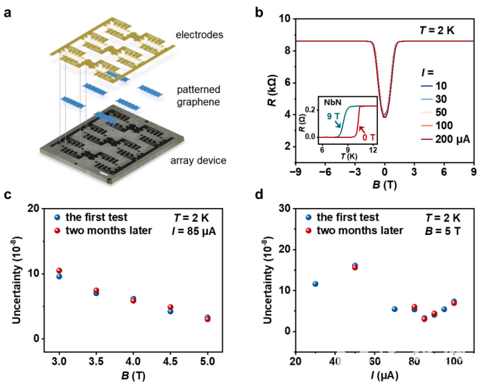 图3、 输出量值为8.604 kΩ的量子电阻阵列的照片和高精度测量结果。