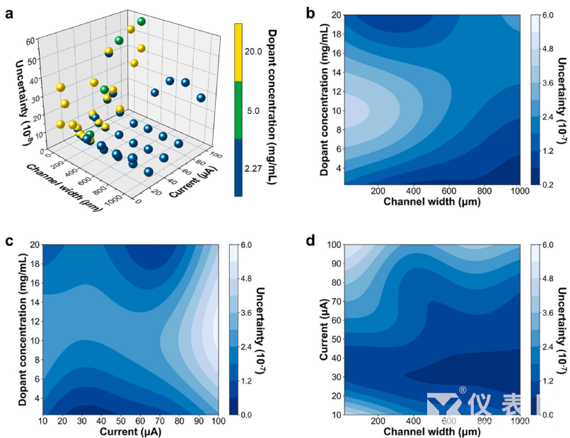 图2 、基于机器学习SVR模型预测的器件不确定度与掺杂浓度、电流、沟道宽度之间的关系图。