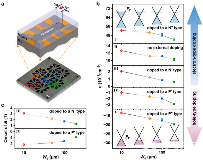 图1、 不同沟道宽度石墨烯霍尔器件中载流子随沟道宽度的变化情况。 a)石墨烯霍尔器件的光镜照片;b) 不同掺杂条件下,载流子密度随沟道宽度变化的曲线;c) 进入量子霍尔平台所需起始磁场与沟道宽度的关系。