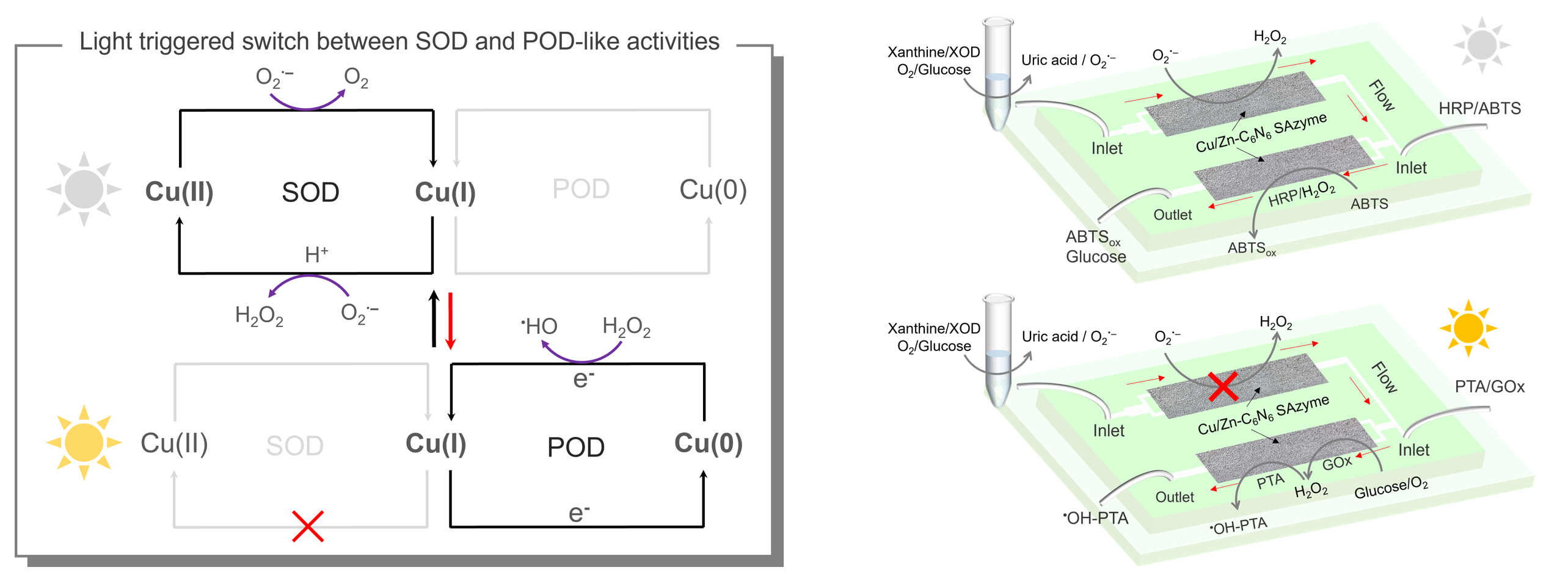 鉴于此,东南大学张袁健团队报道了一种铜/锌双单原子纳米酶。该纳米酶在无光条件下通过一价和二价铜的价态循环实现优异的类超氧物歧化酶(SOD)活性,还能够在光照下通过零价和一价铜的循环反应,展现出独特的类过氧化物酶(POD)活性。此外,通过交替的光照,SOD和POD活性之间的可逆转换效率超过90%以上,比光敏小分子的顺式和反式异构体之间的切换效率还要高30%。利用该纳米酶,研究团队进一步成功应用于单界面智能切换生物传感,并在微流控反应器中实现了葡萄糖和黄嘌呤体外可逆切换检测。考虑到光照优异的时空分辨率和高度可控性,该研究报道的智能生物传感器将为智能人工设备提供集成度更高的动态化学传感界面。
