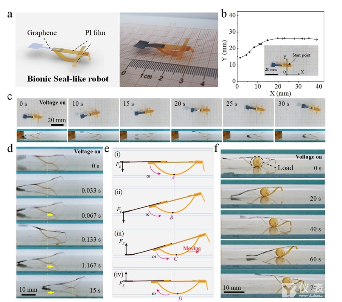 图3 以石墨烯振荡器为马达的仿海豹机器人在电场驱动下自主爬行运动,及携带物体运动