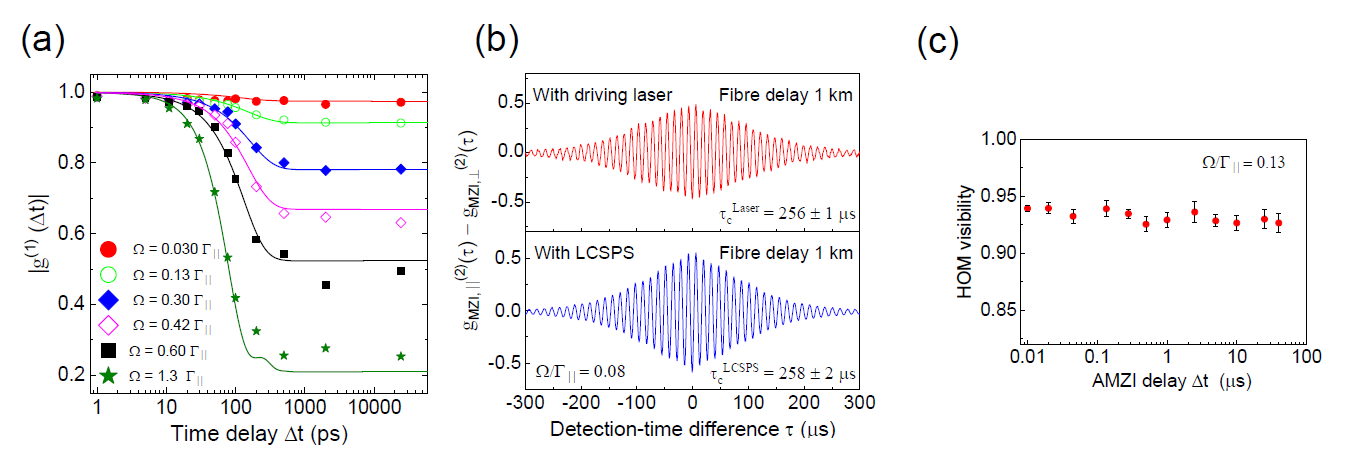 图2 (a)通过Mach-Zehnder干涉仪表征的单光子源一阶相干性;(b)利用延迟自外差干涉与时间分辨符合测量,论证了激光转换型单光子源与驱动激光共享相同的相干时间;(c)双光子干涉可见度随发射时间差的演化,证明了该光源具有鲁棒的光子全同性。