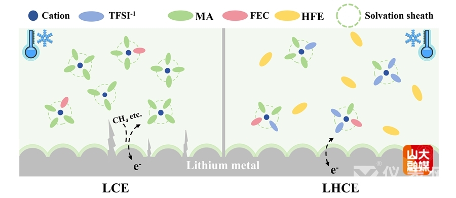 在锂离子电池(LIBs)的研究与应用中,电解液的选择至关重要。然而,在低温环境下锂离子电池电解液粘度增加导致锂离子的迁移速率显著降低,这不仅影响了电池的充放电效率,还可能导致电池在低温下无法正常工作,甚至出现安全隐患。此外,高压环境下还会导致电解液的电化学稳定性下降,增加了电池内部反应的不稳定性,从而影响电池的整体性能和寿命。为此,团队提出了一种基于阴离子保护机制下的乙酸甲酯(MA)局部高浓度电解液,实现了以接触离子对(CIPs)和聚集体(AGGs)为主的溶剂化结构。团队通过理论计算和实验阐明了MA基电解液的阴离子保护机制在低温和高压下的可行性,为开发适合在极端环境中使用的电解液提供了一种有效策略,推动高能量密度锂离子电池在航空航天与极地装备等特种环境中的应用。