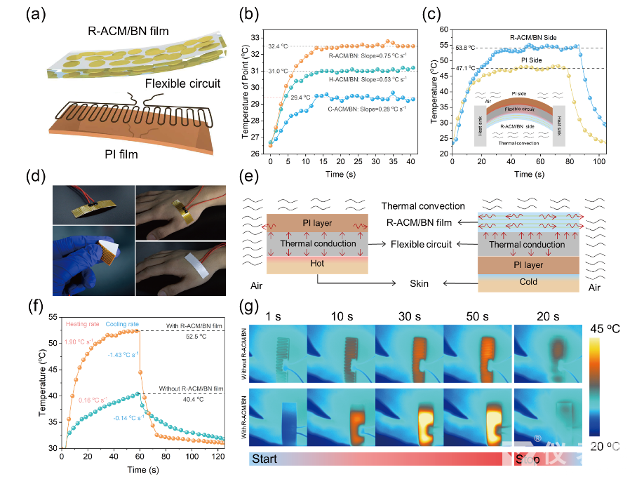 在应用验证方面,研究团队通过热管理测试,展现了该材料在柔性电路、可穿戴设备及高频封装中的高效散热性能与优异贴合性。该仿生结构薄膜在高热导、低损耗与柔性三者之间实现了良好平衡,为解决柔性电子设备在散热、信号传输稳定性及柔性封装等方面技术瓶颈,提供了关键的材料解决方案与设计思路。