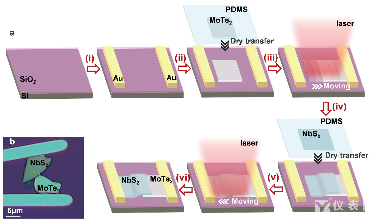 图1 利用光学操纵制备边缘接触MoTe2-NbS2异质结光电探测器。a)光电探测器的制备过程。b)MoTe2-NbS2异质结光电探测器的光学图像。