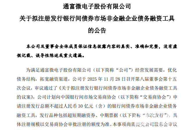11月28日,通富微电(002156.SZ)公告,为满足公司经营发展需要,优化债务结构,拓宽融资渠道,公司于2025年11月28日召开第八届董事会第十五次会议,审议通过了《关于拟注册发行银行间债券市场非金融企业债务融资工具的议案》,公司计划向中国银行间市场交易商协会(以下简称“交易商协会”)申请注册发行总额不超过人民币30亿元(含)的银行间债券市场非金融企业债务融资工具,发行品种包括超短期融资券、中期票据(以下简称“本次发行”),具体注册规模以交易商协会审批注册的额度为准。