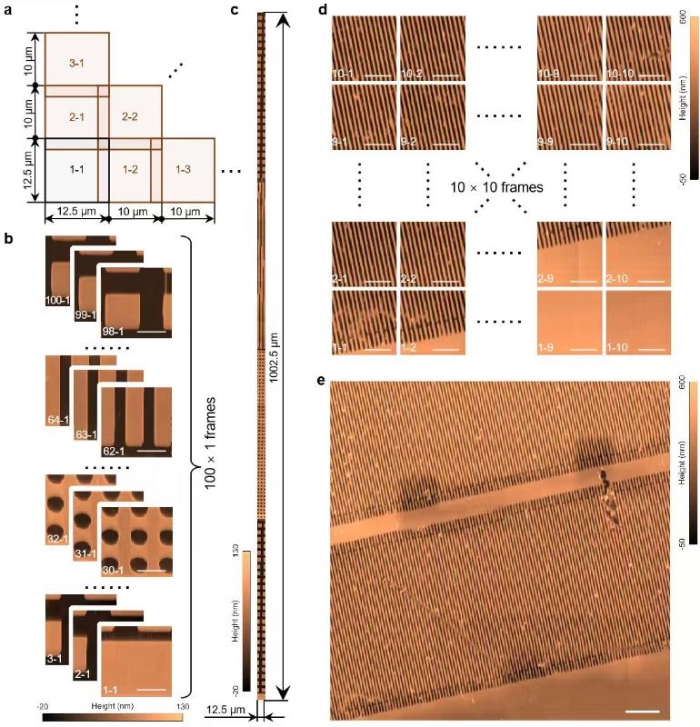 研究将所提出的粘滑纳米定位器与AFM测头集成,实现了毫米级空间范围内,对光栅样品和芯片样品的跨尺度高带宽抽样成像和拼接成像。在保证成像质量的前提下,扫描线频率高达40 Hz,相较于传统的具有毫米级工作空间的直驱AFM纳米定位器,提升了1至2个数量级。该研究表明,通过恰当的控制,典型的粘滑纳米定位器亦可满足AFM成像所需的精度与带宽需求。这一成果突破了AFM扫描运动只能由直驱纳米定位器生成、粘滑纳米定位器只能满足静态纳米定位或大范围粗定位的传统认知,并为下一代AFM提供了跨尺度、高带宽、低成本的纳米定位解决方案。