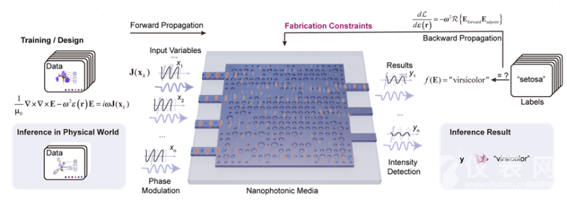 研究团队基于伴随法通过求解麦克斯韦方程数值解获取训练任务损失函数对于阵列结构参数的梯度,并结合加工规则约束,实现对散射介质结构的智能化设计。如图1所示,经过智能化设计后的器件,能够对多个输入光波导中传播光波的相位信息进行高效处理,并将运算结果直接映射到输出波导的光波强度上。通过比较不同输出波导的光强,即可获取推理结果。输入信息的加载,则可通过片上集成的移相器便捷实现,进一步提升了系统的集成度与可控性。