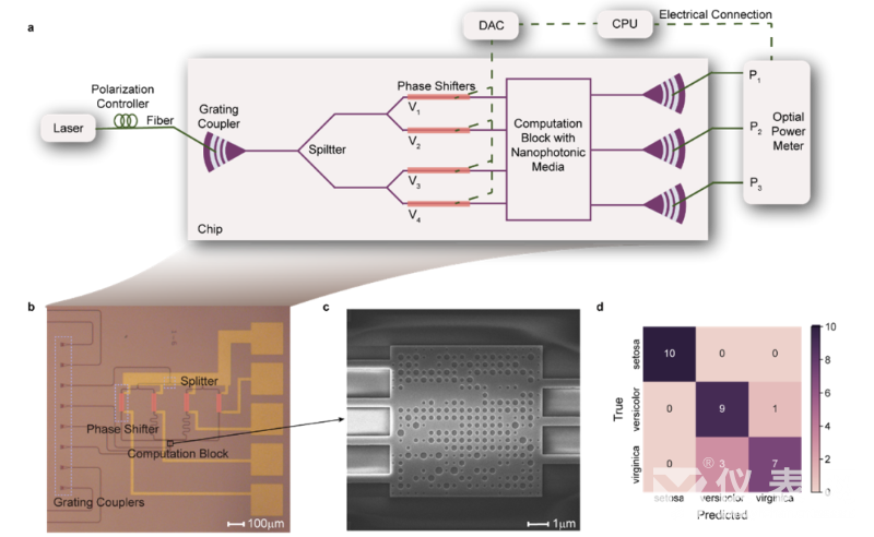 研究团队进一步对面向鸢尾花分类任务所设计的器件进行了微纳加工与实验测试(图3),实现了86.7%的测试准确率。实验中,不同样本的特征信息通过片上集成的热调移相器进行加载,输出光信号则由光电探测器采集并转换为推理结果。团队还测试了器件在一定带宽范围内的性能表现,结果间接表明其在更高频率输入环境下具备应用潜力。未来采用电调移相器等方案加载输入信息,将有望实现超低延迟的推理能力。