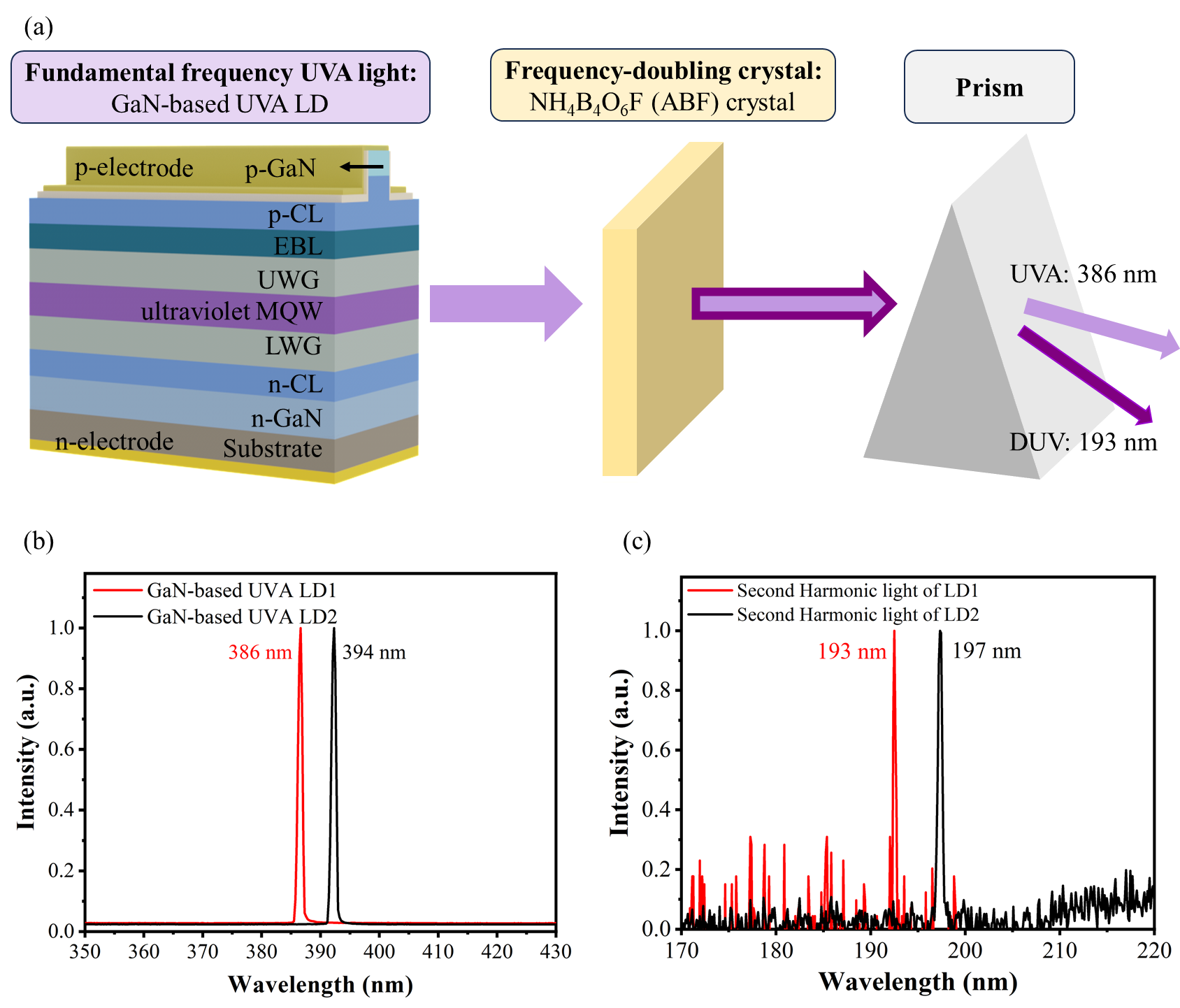 图1. (a)基于GaN近紫外激光器和ABF深紫外非线性晶体的直接倍频技术原理,(b)基频光源光谱:GaN基386nm和394nm半导体激光器,(c)直接倍频后获得的193nm、197nm深紫外激光光谱。