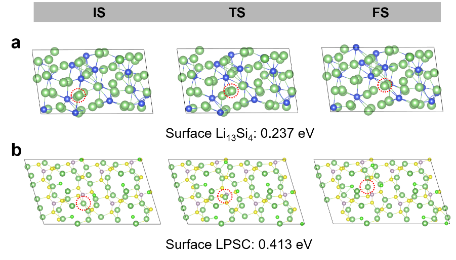 密度泛函理论(DFT)计算进一步揭示,Li13Si4体相与表面的Li⁺迁移势垒远低于固态电解质Li6PS5Cl,为负极内部提供了额外的“高速离子通道”。原位EIS-DRT分析证实,复合负极的界面电荷转移阻抗和固态扩散阻抗均显著降低,实现了快速、可逆的锂化/脱锂过程。理论计算的结果表明,“玄武岩状多孔硅+Li13Si4”的“预锂化-堡垒”协同策略可有效解决界面退化、不可逆锂消耗及机械不稳定问题,显著提高BSPSi+Li13Si4复合负极的电化学活性,为全固态电池领域高性能硅基负极的设计开发提供了新的思路。