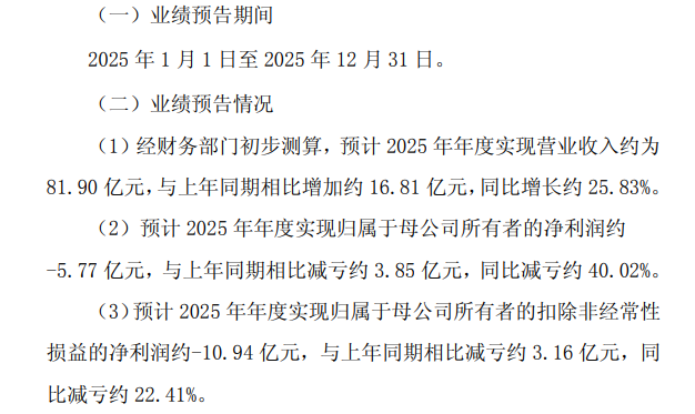 1月21日,芯联集成(688469)发布2025年度业绩预告,公司2025年预计实现营收约81.90亿元,同比增长约25.83%;预计实现归母净利润约-5.77亿元,同比减亏约40.02%;预计实现归母扣非净利润约-10.94亿元,同比减亏约22.41%。