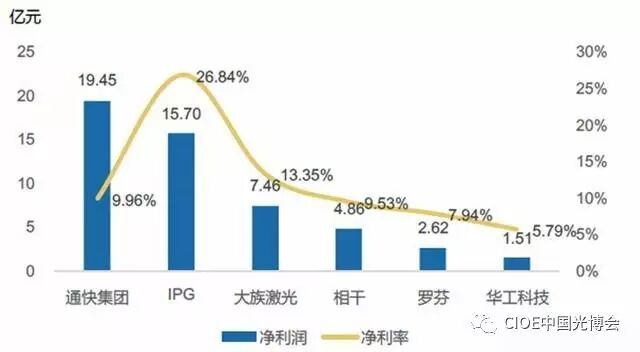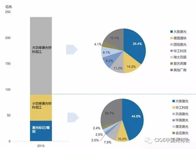 国内销售的中小功率加工设备基本由国内厂商自产,其中大族激光市场份额接近50%,华工科技市场份额超过10%。大功率激光设备市场竞争更为激烈,国际厂商如德国通快、瑞士百超等都占有较大份额,但大族激光在此领域中的市场份额依然达到了35.4%。
