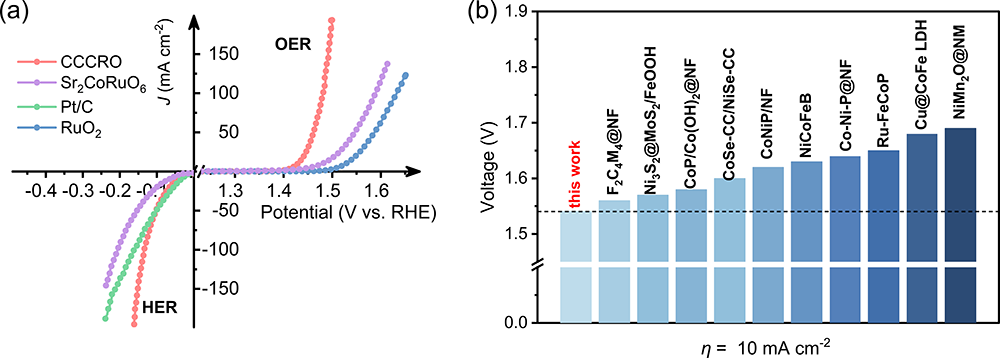 图:CCCRO电催化性能展示。(a) CCCRO与同类、商业催化剂的阴、阳极电极化比较曲线;(b)与已报道高活性水全分解催化剂在电流密度10 mA cm-2下的过电位对比。