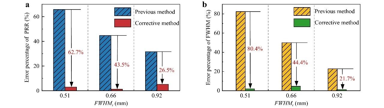 两种测量方法测量误差的对比(a)峰值去除率的误差百分比(b)半宽高的误差百分比