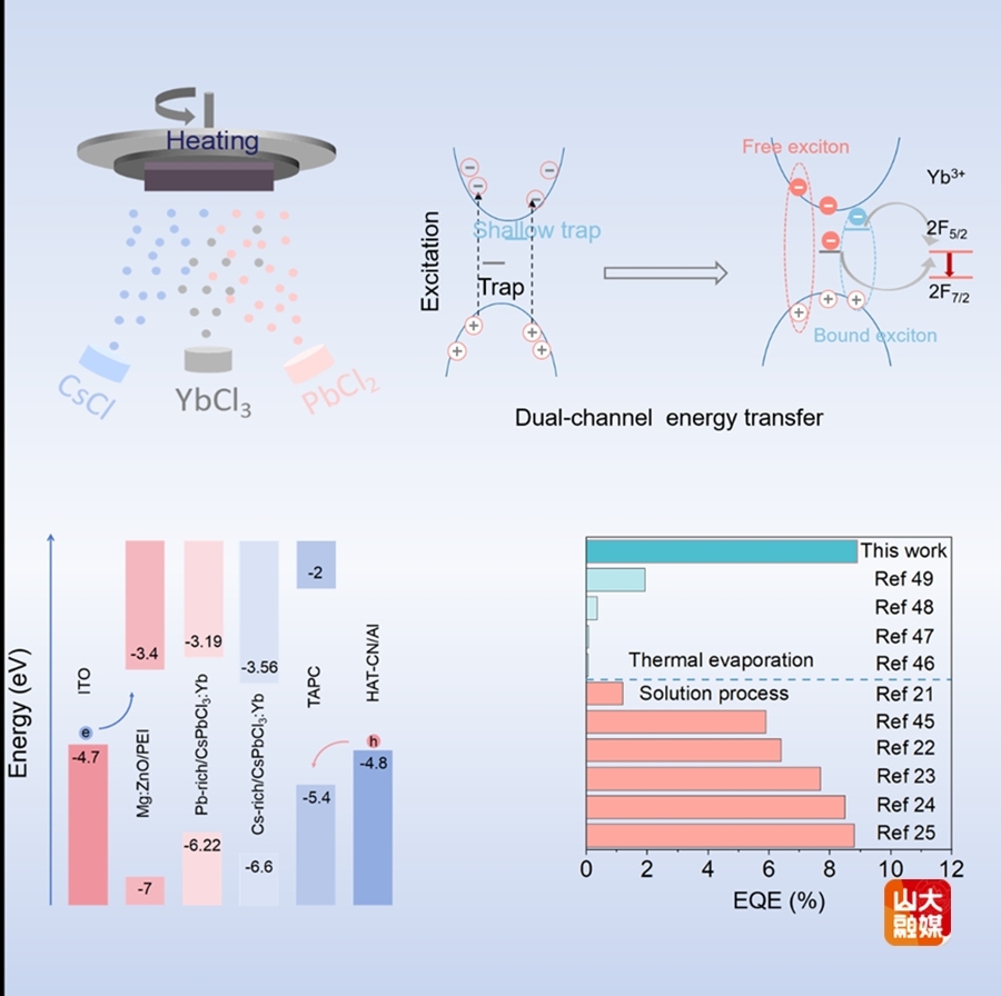 近日,山东大学集成电路学院教授王亮和化学与化工学院教授于伟泳联合,在稀土镱(Yb)掺杂铯铅氯(CsPbCl3)近红外发光二极管研究领域取得新进展,成果以“Exciton Localization Engineering in Thermally Evaporated Yb-Doped CsPbCl3 Near-Infrared Light-Emitting Diodes”为题发表在期刊Advanced Materials(影响因子26.8)。王亮教授、于伟泳教授为论文的共同通讯作者,山东大学化学与化工学院硕士研究生王烁为第一作者。