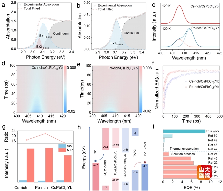 图1. (a-g) 富铅富铯体系的光学表征,(h)器件结构,(i)热蒸发法与溶液法制备的近红外钙钛矿发光二极管外量子效率汇总