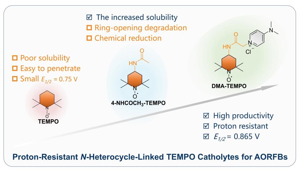 中性水系有机液流电池(AORFBs)因其资源丰富、分子结构可调、本征安全性高以及环境友好等特点,在大规模储能领域展现出广阔的应用前景,有望推动可再生能源从辅助能源向主导能源的转变。电解液作为液流电池的关键组成部分和能量存储的核心单元,其性能直接决定了电池的成本、能量密度与循环寿命。2,2,6,6-四甲基哌啶-1-氧自由基(TEMPO)是当前AORFBs中研究最为广泛的正极电解液材料,然而在其4号位引入亲水性取代基以提高溶解度的过程中,会引发质子诱导的开环降解反应,从而导致分子结构破坏和电池容量的快速衰减,这也极大限制了AORFBs的研究及产业化进展。