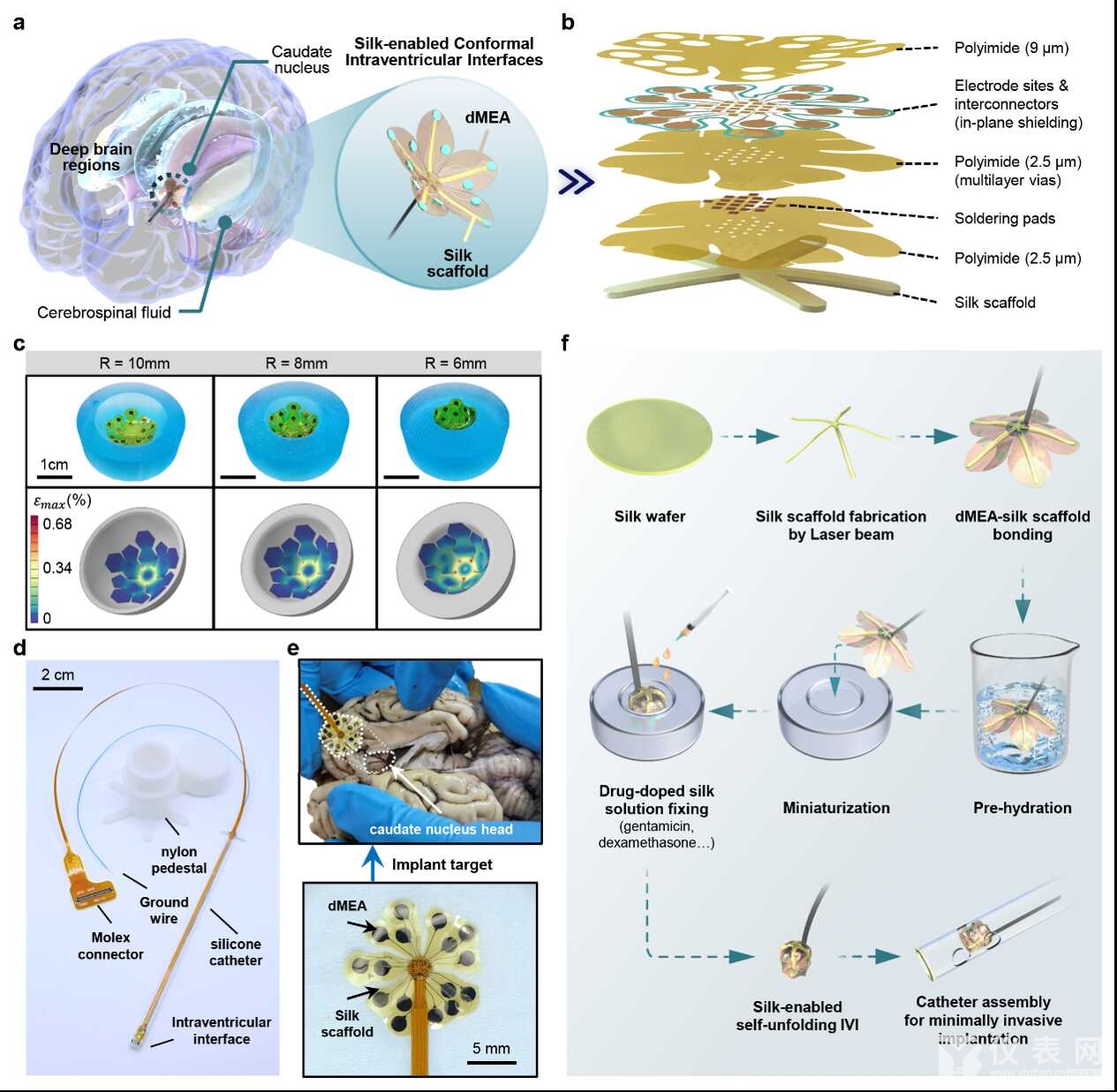丝蛋白赋能微创植入式脑室内柔性神经界面总体概览:微创递送与自展开贴附示意、器件爆炸图、曲面适形有限元仿真与实物验证、系统实物、可变形微电极与丝蛋白支架,以及微创植入界面器件的集成
