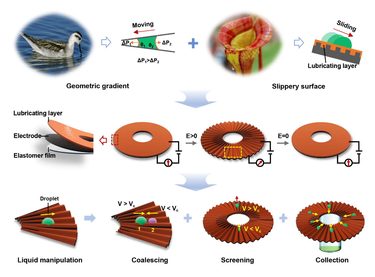 图1 电场自适应起皱表面的设计。EFAWS的设计灵感来自于滨鸟喙喝水时不对称毛细力和猪笼草笼口边缘液体润滑层。在电场作用下可实时控制褶皱形貌,用于液滴聚结、筛选和收集