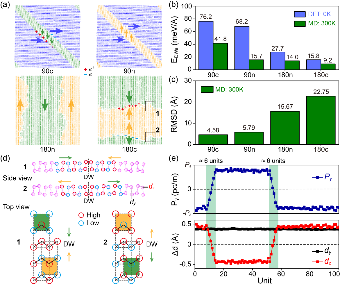 铁电材料中,畴界作为分隔不同极化取向区域的关键界面,其结构直接影响材料的电导率、电磁耦合等功能特性。传统铁电材料中的畴界多呈现头-尾排列的电中性构型,以尽可能降低静电能。然而,近年来在单质铋(Bi)单层二维铁电材料中发现的本征稳定180°带电畴界,突破了这一传统认知,为铁电畴界的基础研究与功能器件应用开辟了新方向。由于二维铋烯中电子型极化较弱,其畴界能主要由应变能主导,而非传统铁电材料中的静电能,这使得180°带电畴界成为该体系中最稳定的畴界构型。在此背景下,理解并调控此类带电畴界在有限温度下的动态行为及其所形成的拓扑畴结构,已成为实现其功能化应用的关键挑战。