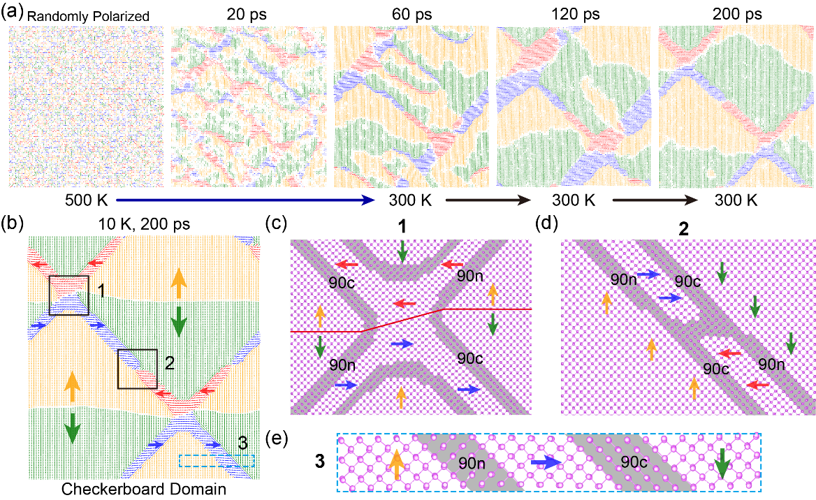 进一步通过高温退火模拟,团队发现了Bi烯具有独特的“畴对交织”的棋盘状拓扑畴结构(一组极化相反铁电畴称为一个“畴对”)。其中,180°带电畴界决定了两组正交铁电畴对的形成,而90°畴界则为不同畴对之间的转变提供了媒介(图2)。此外,研究中观察到的四种不同方向铁电畴交汇处形成的涡旋拓扑畴结构,具有优异的拓扑稳定性。本项研究首次在单质二维铁电体中揭示了由带电畴界主导的拓扑畴结构及其动态演化规律,为理解与设计新型铁电拓扑材料提供了全新的理论基础与实现路径,有望在高密度数据存储、神经形态计算、量子器件及柔性电子等领域获得应用。