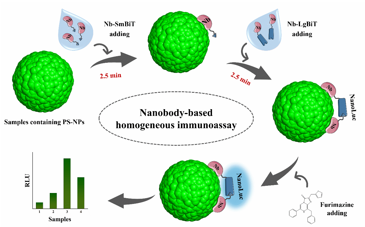 针对上述问题,青岛能源所蛋白质材料研究组立足前期研究基础,依托筛选获得的高亲和力聚苯乙烯结合纳米抗体B2,构建融合分裂型纳米荧光素酶亚基(SmBiT/LgBiT)的双功能探针,开发出一种基于纳米抗体与分裂荧光素酶技术的均相免疫分析方法,成功实现对20纳米聚苯乙烯纳米塑料的高灵敏、快速定量检测。其核心原理为当分别标记SmBiT和LgBiT的B2探针同时结合在同一纳米塑料表面时,分裂的荧光素酶亚基发生互补重构,产生可定量检测的发光信号,以此实现对目标纳米塑料的精准识别与定量分析,为环境纳米塑料污染溯源、风险评估与监管决策提供了重要技术支撑。