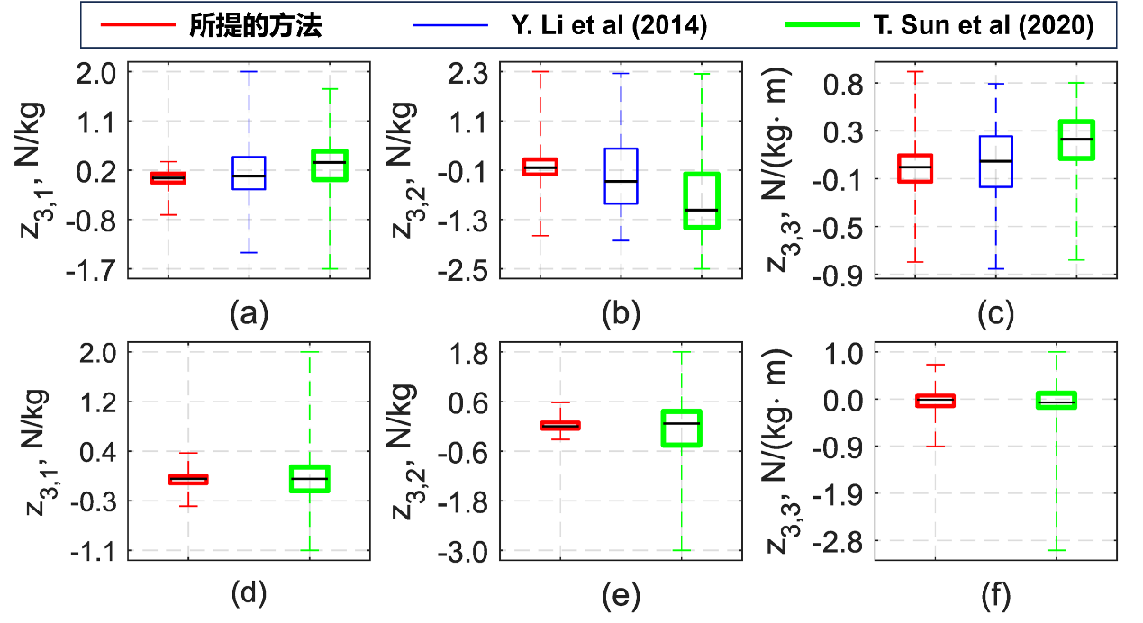 图3:力偏差分布。(a)-(c) 过阻尼的阻抗控制。(d)-(f) 欠阻尼的阻抗控制